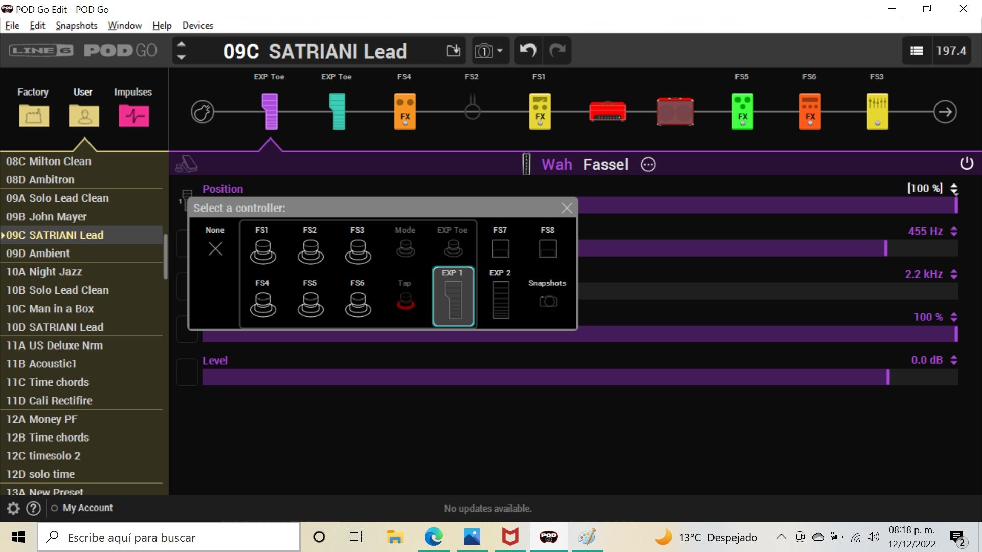 Rafter_jh Posted December 13, 2022 Share Posted December 13, 2022 I have two years with my POD Go and everything was perfect until I realized that when I move to physical position of the Exp Pedal does not change the effect. If I'm using a Wha the Exp Toe does work, but it stays at 100% of the wha and doesn't change when I move the pedal. In the case of Vol the same thing happens, the volume does not go down if you lower the pedal and vice versa. Tengo dos años con mi POD Go y todo estaba perfecto hasta que me di cuenta de que cuando muevo a posición física del Exp Pedal no cambia el efecto. Si estoy utilizando un Wha el Exp Toe si funciona, pero se queda en el 100% del wha y no cambia cuando muevo el pedal. En el caso del Vol sucede lo mismo, el volumen no baja si bajo el pedal y viceversa. Tengo el Firmware 1.40 1 Quote Link to comment Share on other sites More sharing options...