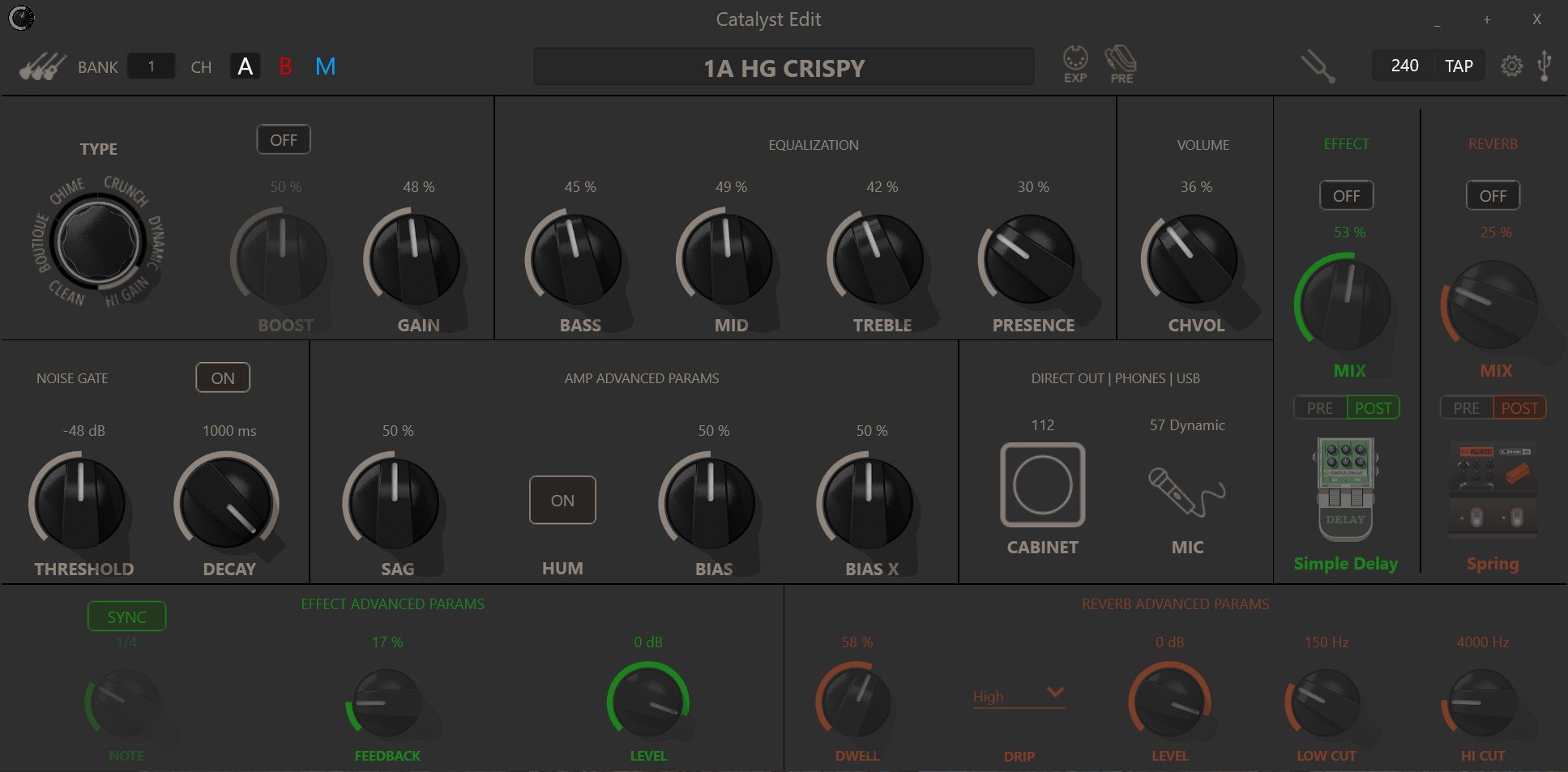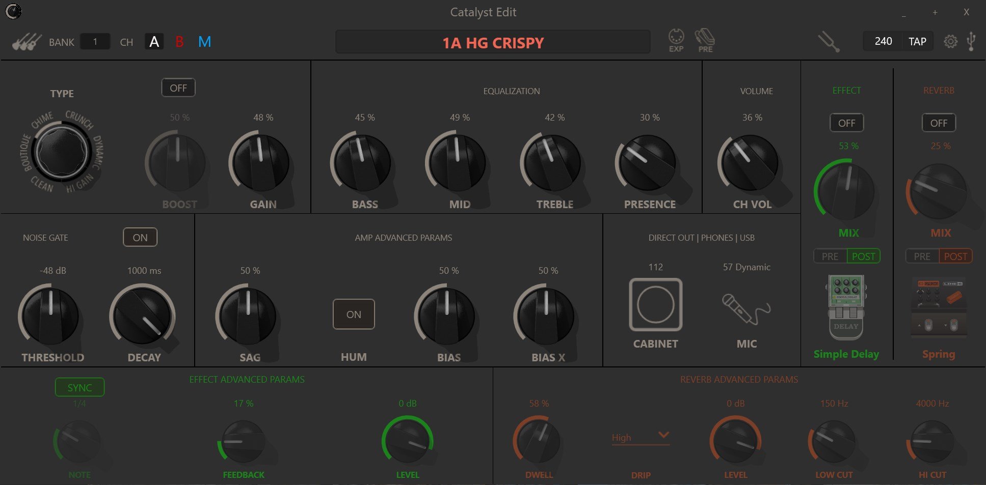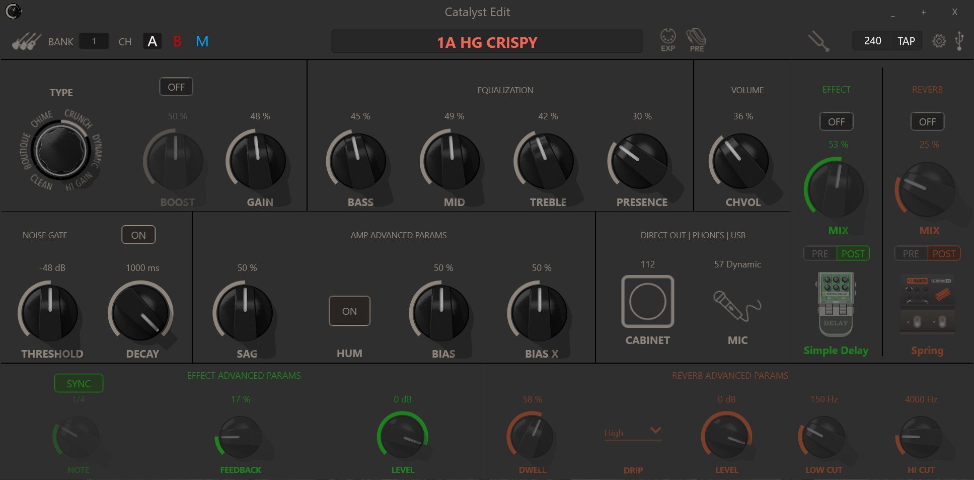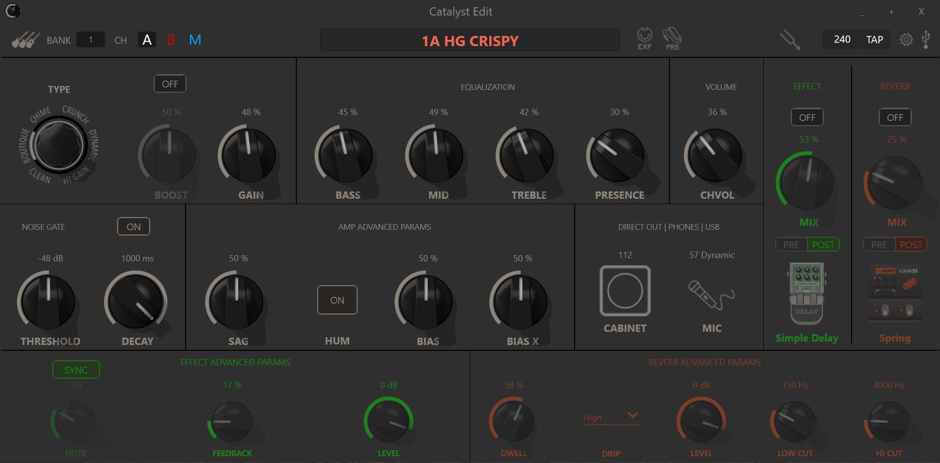 When viewing my Catalyst 60 settings in the Catalyst Edit software, the settings shown in the software don't update when changing through the presets. See screenshots of Bank 1A (1A HG Crispy is a modified version of the Bank 1A High Gain preset). Each preset displays the exact same settings, as well as the same preset name, with the exception of the Amp Advanced Parameters. The result is I have no idea what any of the preset default settings are. Everything else seems to work normally - modifying the settings, saving changes, backup,  etc. I've done a factory reset on the amplifier, but that hasn't fixed the issue.